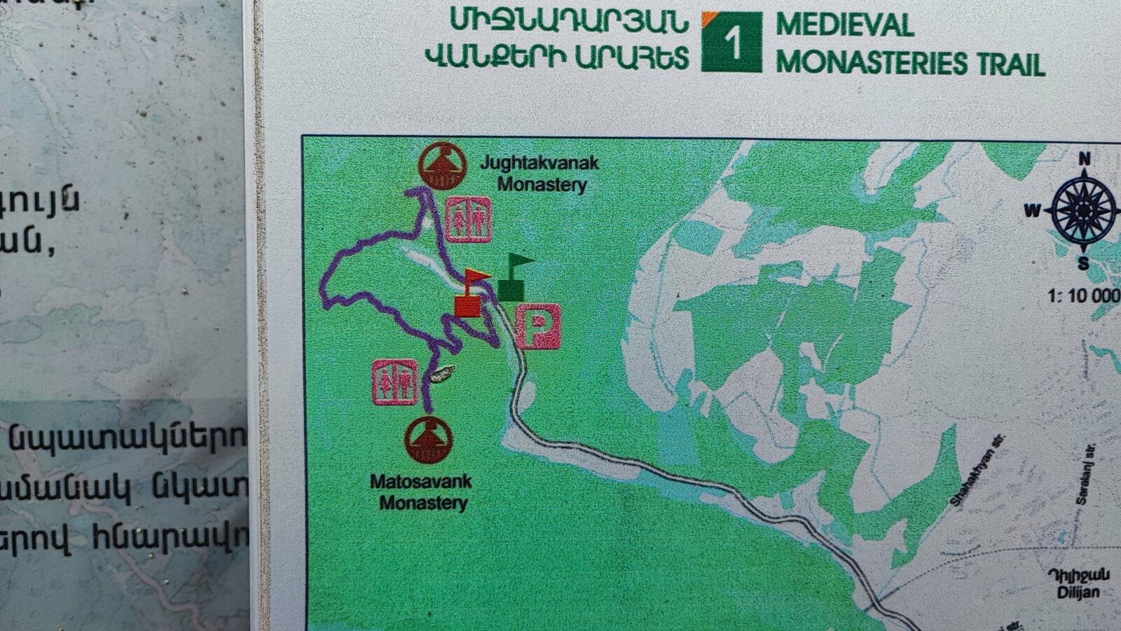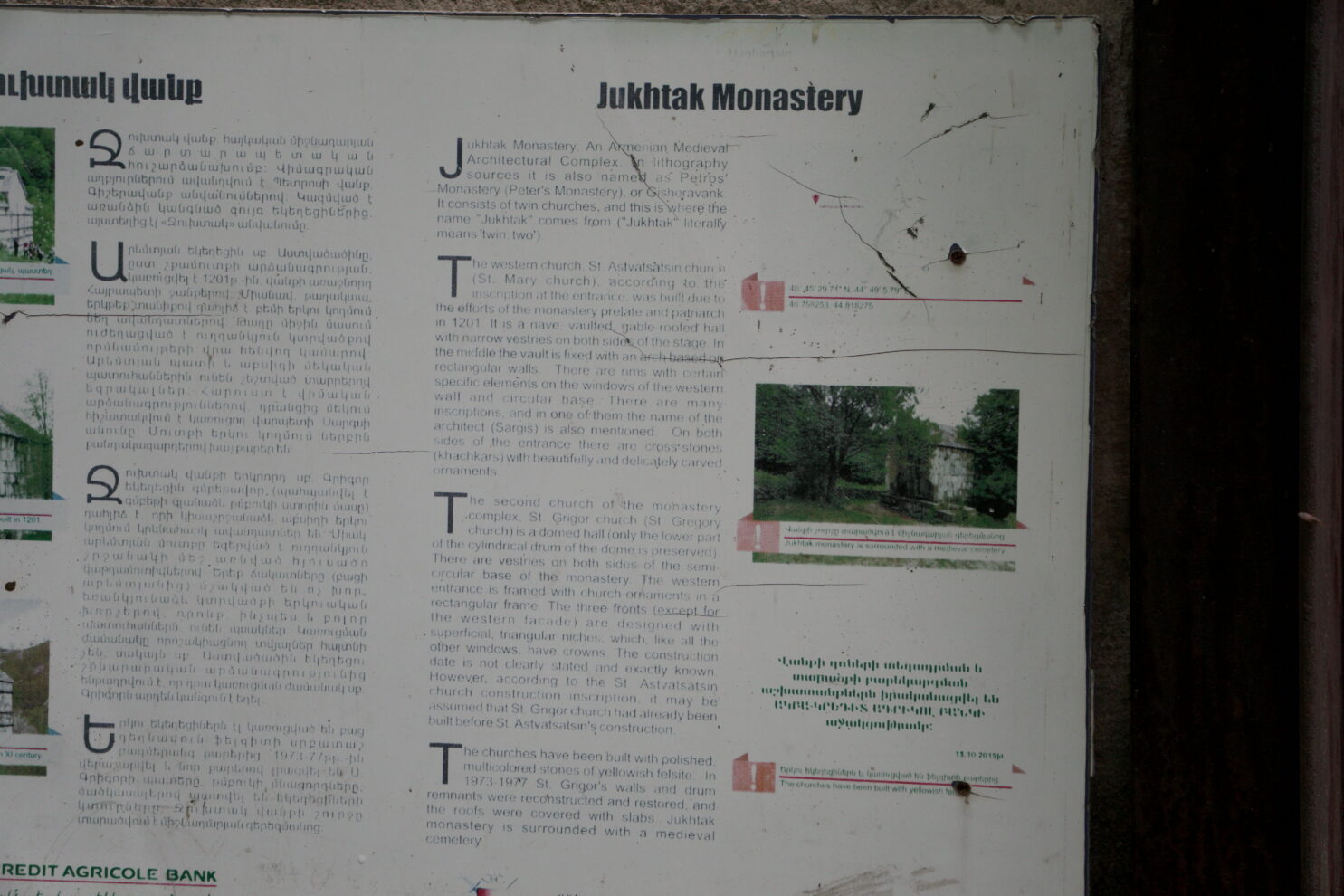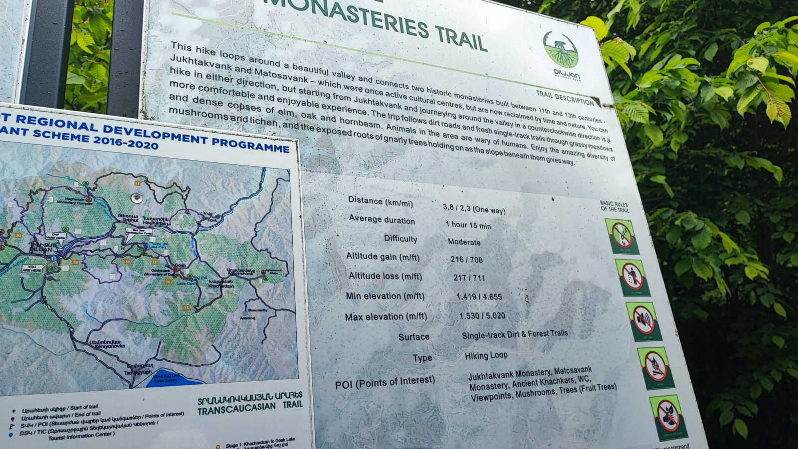 Poniżej kilka zdjęć tablic informacyjnych. Większość osób dochodzi jedynie do pierwszego klasztoru Jukhtakvank, później trasa jest mniej wydeptana. Niektóre odcinki szlaku trzeba pokonać idąc rzeką, więc gdy leje deszcz może być to mocno kłopotliwe. My jednak nie poddaliśmy się mimo początkowego deszczu i chłodnej aury. Przeszliśmy cały szlak. Zajęło nam to około 2 h.